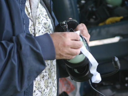 Velcro straps help secure George's headset. While taking approach shots, George leans into the airstream and is subject to 100mph winds.
