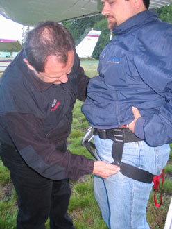 John double-checks that George's harness is on correctly. When up in the air, George will be secured to connection points - one in the front of the plane and one in the back.